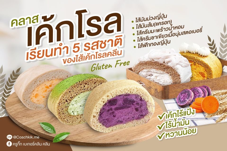 - คลาสเค้กโรลคลีน 5 รสชาติ เผยสูตรลับขนมคลีน ที่ทำได้ง่าย มีพื้นฐาน = 0 เริ่มต้นได้ และขายดี ผลงานมากมายจากนักเรียนในคลาส