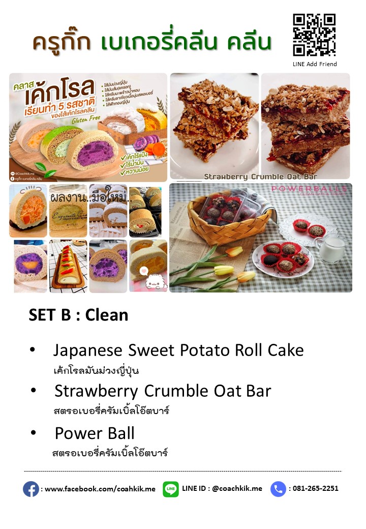 - คลาสเค้กโรลคลีน 5 รสชาติ เผยสูตรลับขนมคลีน ที่ทำได้ง่าย มีพื้นฐาน = 0 เริ่มต้นได้ และขายดี ผลงานมากมายจากนักเรียนในคลาส